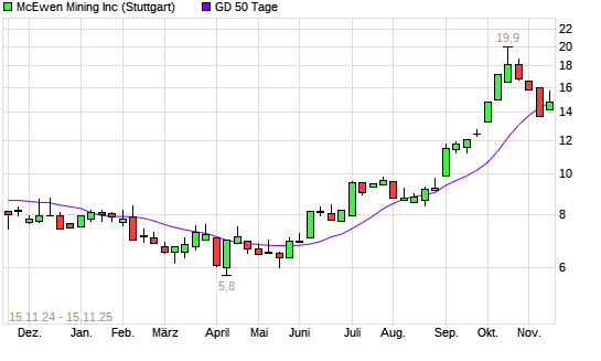 Mit dem Rücksetzer auf 14,50 EUR hat die McEwen Mining-Aktie am 14.11.2025 die 50-Tage-Linie nach unten gekreuzt.Die McEwen Mining-Aktie befindet sich seit dem 04.06.2025 im langfristigen ...weiterlesen