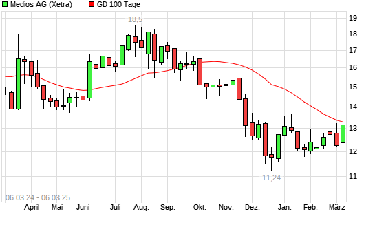 Mit dem Anstieg auf 13,34 EUR hat die Medios-Aktie am 05.03.2025 die 100-Tage-Linie nach oben gekreuzt.Die Medios-Aktie befindet sich seit dem 13.11.2024 im langfristigen Abwärtstrend und hat ...weiterlesen
