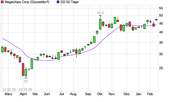 Mit dem Anstieg auf 47,60 EUR hat die Megachips-Aktie am 09.02.2026 die 50-Tage-Linie nach oben gekreuzt.Die Megachips-Aktie befindet sich seit dem 13.08.2025 im langfristigen Aufwärtstrend ...weiterlesen
