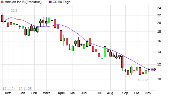 Mit dem Rücksetzer auf 11,08 EUR hat die Meituan-Aktie am 12.11.2025 die 50-Tage-Linie nach unten gekreuzt.Die Meituan-Aktie befindet sich seit dem 04.04.2025 im langfristigen Abwärtstrend ...weiterlesen