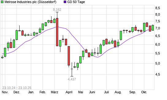 Mit dem Anstieg auf 7,24 EUR hat die Melrose Industries-Aktie am 22.10.2025 die 50-Tage-Linie nach oben gekreuzt.Die Melrose Industries-Aktie befindet sich seit dem 04.08.2025 im langfristigen ...weiterlesen