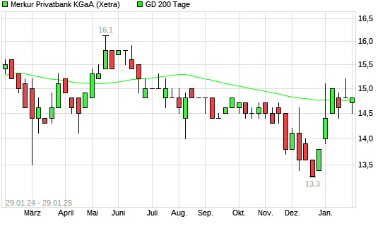 Mit dem Rücksetzer auf 14,60 EUR hat die Merkur Bank-Aktie am 28.01.2025 die 200-Tage-Linie nach unten gekreuzt.Die Merkur Bank-Aktie befand sich seit dem 21.01.2025 im langfristigen Aufwärtstrend ...weiterlesen