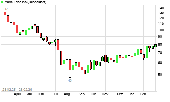 Mit dem Anstieg auf 80,50 EUR hat die Mesa Laboratories-Aktie (ISIN US59064R1095) am 27.02.2026 ein neues 6-Monats-Hoch erreicht und damit den Kurs vom 25.02.2026 eingestellt.Die ...weiterlesen