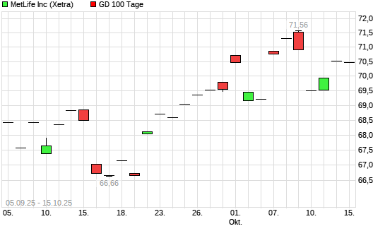 Mit dem Rücksetzer auf 66,72 EUR hat die MetLife-Aktie am 16.10.2025 die 100-Tage-Linie nach unten gekreuzt.Die MetLife-Aktie befindet sich seit dem 15.10.2025 im langfristigen Abwärtstrend ...weiterlesen