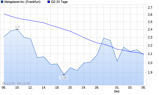 Mit dem Rücksetzer auf 2,09 EUR hat die Metaplanet-Aktie am 05.12.2025 die 20-Tage-Linie nach unten gekreuzt.Die Metaplanet-Aktie befindet sich seit dem 04.09.2025 im langfristigen Abwärtstrend ...weiterlesen