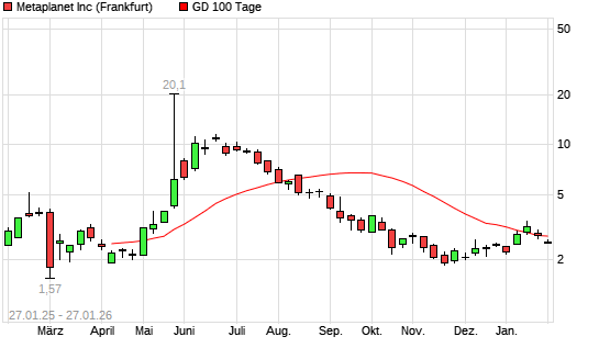 Mit dem Rücksetzer auf 2,54 EUR hat die Metaplanet-Aktie am 26.01.2026 die 100-Tage-Linie nach unten gekreuzt.Die Metaplanet-Aktie befindet sich seit dem 04.09.2025 im langfristigen Abwärtstrend ...weiterlesen