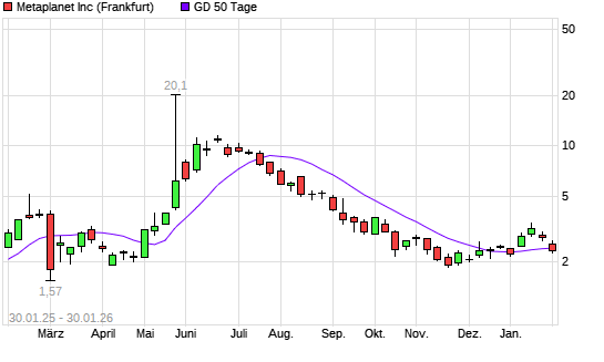 Mit dem Rücksetzer auf 2,33 EUR hat die Metaplanet-Aktie am 29.01.2026 die 50-Tage-Linie nach unten gekreuzt.Die Metaplanet-Aktie befindet sich seit dem 04.09.2025 im langfristigen Abwärtstrend ...weiterlesen