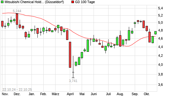Mit dem Anstieg auf 4,73 EUR hat die Mitsubishi Chemical-Aktie am 21.10.2025 die 100-Tage-Linie nach oben gekreuzt.Die Mitsubishi Chemical-Aktie befindet sich seit dem 20.10.2025 im langfristigen ...weiterlesen