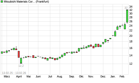 Mit dem Anstieg auf 32,00 EUR hat die Mitsubishi Materials-Aktie (ISIN JP3903000002) am 12.02.2026 ein neues 5-Jahres-Hoch erreicht und damit den Kurs vom 11.02.2026 ...weiterlesen