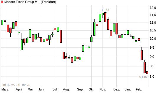 Mit dem Rücksetzer auf 8,15 EUR hat die Modern Times Group B-Aktie (ISIN SE0018012494) am 17.02.2026 ein neues 12-Monats-Tief erreicht und damit den Kurs vom ...weiterlesen