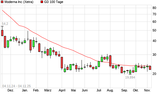 Mit dem Rücksetzer auf 21,99 EUR hat die Moderna-Aktie am 03.11.2025 die 100-Tage-Linie nach unten gekreuzt.Die Moderna-Aktie befindet sich seit dem 01.08.2024 im langfristigen Abwärtstrend ...weiterlesen