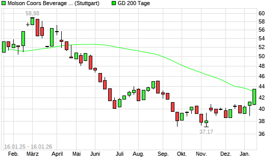 Mit dem Anstieg auf 42,99 EUR hat die Molson Coors Brewing-Aktie am 15.01.2026 die 200-Tage-Linie nach oben gekreuzt.Die Molson Coors Brewing-Aktie befand sich seit dem 15.04.2025 im langfristigen ...weiterlesen