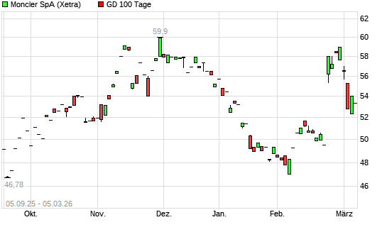 Mit dem Anstieg auf 54,06 EUR hat die Moncler-Aktie am 04.03.2026 die 100-Tage-Linie nach oben gekreuzt.Die Moncler-Aktie befindet sich seit dem 19.02.2026 im langfristigen ...weiterlesen
