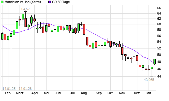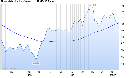 Mit dem Rücksetzer auf 50,16 EUR hat die Mondelez-Aktie am 05.03.2026 die 38-Tage-Linie nach unten gekreuzt.Die Mondelez-Aktie befindet sich seit dem 03.03.2026 im ...weiterlesen
