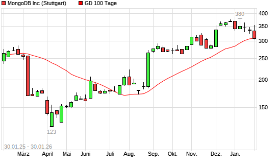 Mit dem Rücksetzer auf 311,00 EUR hat die MongoDB-Aktie am 29.01.2026 die 100-Tage-Linie nach unten gekreuzt.Die MongoDB-Aktie befindet sich seit dem 27.08.2025 im langfristigen Aufwärtstrend ...weiterlesen