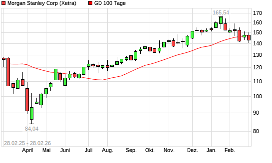 Mit dem Rücksetzer auf 140,22 EUR hat die Morgan Stanley-Aktie am 27.02.2026 die 100-Tage-Linie nach unten gekreuzt.Die Morgan Stanley-Aktie befindet sich seit dem 19.06.2025 ...weiterlesen