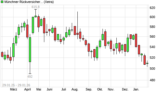 Mit dem Rücksetzer auf 508,60 EUR hat die Münchener Rück-Aktie (ISIN DE0008430026) am 28.01.2026 ein neues 12-Monats-Tief erreicht und damit den Kurs vom 23.01.2026 eingestellt.Die Münchener ...weiterlesen
