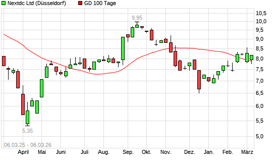 Mit dem Anstieg auf 7,95 EUR hat die NEXTDC-Aktie am 05.03.2026 die 100-Tage-Linie nach oben gekreuzt.Die NEXTDC-Aktie befindet sich seit dem 04.03.2026 im langfristigen Abwärtstrend ...weiterlesen