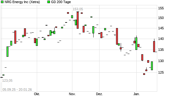 Mit dem Rücksetzer auf 127,35 EUR hat die NRG Energy-Aktie am 19.01.2026 die 200-Tage-Linie nach unten gekreuzt.Die NRG Energy-Aktie befand sich seit dem 16.01.2026 im langfristigen Aufwärtstrend ...weiterlesen