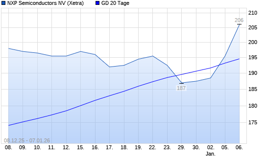 Mit dem Anstieg auf 194,00 EUR hat die NXP Semiconductors-Aktie am 06.01.2026 die 20-Tage-Linie nach oben gekreuzt.Die NXP Semiconductors-Aktie befindet sich seit dem 02.12.2025 im langfristigen ...weiterlesen