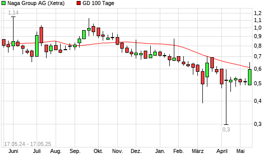 Mit dem Rücksetzer auf 0,56 EUR hat die Naga Group-Aktie am 16.05.2025 die 100-Tage-Linie nach unten gekreuzt.Die Naga Group-Aktie befindet sich seit dem 21.01.2025 im langfristigen Abwärtstrend ...weiterlesen
