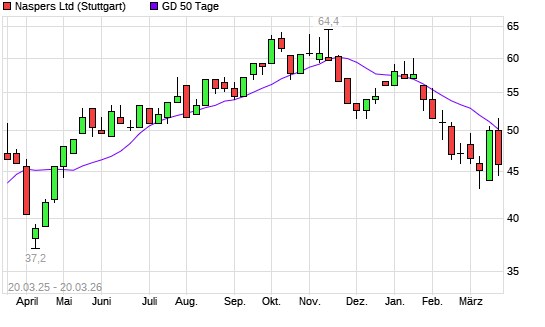 Mit dem Rücksetzer auf 46,60 EUR hat die Naspers-Aktie am 19.03.2026 die 50-Tage-Linie nach unten gekreuzt.Die Naspers-Aktie befindet sich seit dem 29.01.2026 im ...weiterlesen