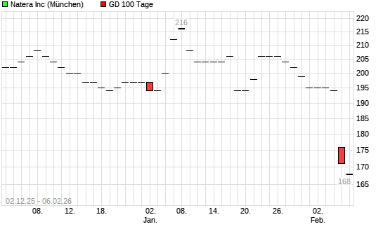 Mit dem Rücksetzer auf 172,00 EUR hat die Natera-Aktie am 05.02.2026 die 100-Tage-Linie nach unten gekreuzt.Die Natera-Aktie befindet sich seit dem 15.09.2025 im langfristigen Aufwärtstrend ...weiterlesen