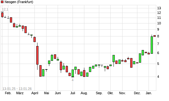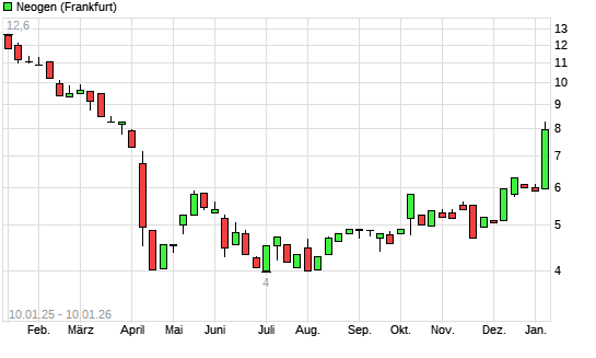 Mit dem Anstieg auf 7,95 EUR hat die Neogen-Aktie (ISIN US6404911066) am 09.01.2026 ein neues 6-Monats-Hoch erreicht und damit den Kurs vom 19.12.2025 eingestellt.Die Neogen-Aktie befindet sich ...weiterlesen