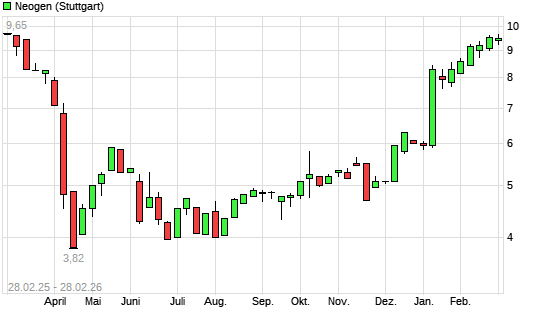 Mit dem Anstieg auf 9,50 EUR hat die Neogen-Aktie (ISIN US6404911066) am 27.02.2026 ein neues 6-Monats-Hoch erreicht und damit den Kurs vom 26.02.2026 eingestellt.Die Neogen-Aktie ...weiterlesen