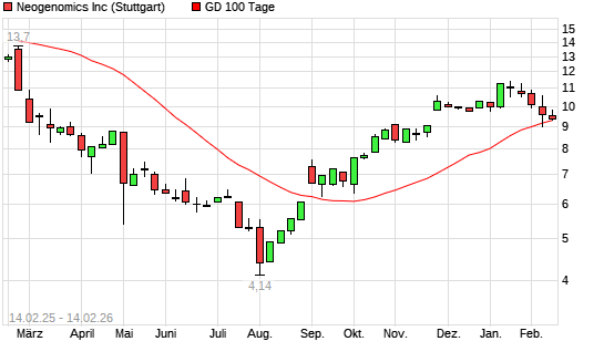 Mit dem Rücksetzer auf 9,30 EUR hat die Neogenomics-Aktie am 13.02.2026 die 100-Tage-Linie nach unten gekreuzt.Die Neogenomics-Aktie befindet sich seit dem 15.10.2025 im langfristigen Aufwärtstrend ...weiterlesen