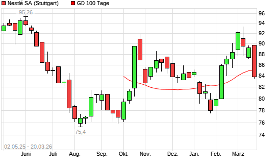 Mit dem Rücksetzer auf 83,95 EUR hat die Nestlé-Aktie am 19.03.2026 die 100-Tage-Linie nach unten gekreuzt.Die Nestlé-Aktie befindet sich seit dem 04.02.2026 im ...weiterlesen