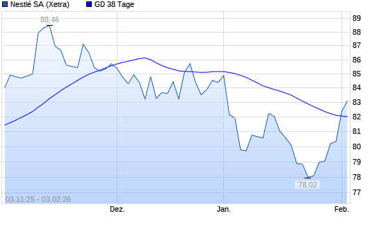 Mit dem Anstieg auf 82,48 EUR hat die Nestlé-Aktie am 02.02.2026 die 38-Tage-Linie nach oben gekreuzt.Die Nestlé-Aktie befindet sich seit dem 24.11.2025 im ...weiterlesen