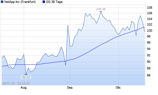 Mit dem Rücksetzer auf 99,53 EUR hat die NetApp-Aktie am 17.10.2025 die 38-Tage-Linie nach unten gekreuzt.Die NetApp-Aktie befindet sich seit dem 03.09.2025 im langfristigen Aufwärtstrend ...weiterlesen