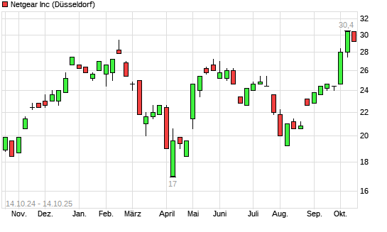 Mit dem Anstieg auf 30,60 EUR hat die Netgear-Aktie (ISIN US64111Q1040) am 13.10.2025 ein neues 3-Jahres-Hoch erreicht und damit den Kurs vom 10.10.2025 eingestellt.Die Netgear-Aktie befindet ...weiterlesen