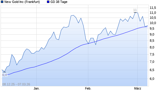 Mit dem Anstieg auf 9,78 EUR hat die New Gold-Aktie am 06.03.2026 die 38-Tage-Linie nach oben gekreuzt.Der Abstand zur 200-Tage-Linie beträgt aktuell +54,91%. Die New ...weiterlesen