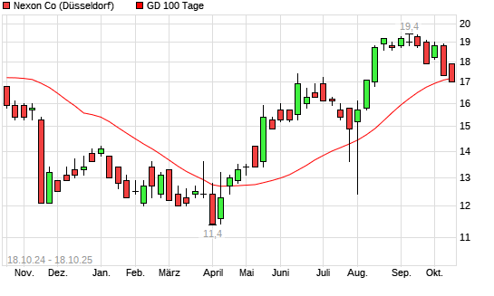 Mit dem Rücksetzer auf 17,00 EUR hat die Nexon-Aktie am 17.10.2025 die 100-Tage-Linie nach unten gekreuzt.Die Nexon-Aktie befindet sich seit dem 14.05.2025 im ...weiterlesen