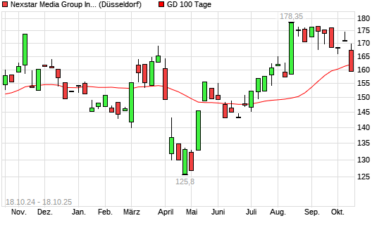 Mit dem Rücksetzer auf 159,40 EUR hat die Nexstar Broadcast Group-Aktie am 17.10.2025 die 100-Tage-Linie nach unten gekreuzt.Die Nexstar Broadcast Group-Aktie befindet sich seit dem 09.07.2025 ...weiterlesen