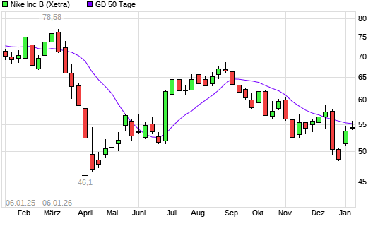 Mit dem Anstieg auf 54,99 EUR hat die Nike-Aktie am 05.01.2026 die 50-Tage-Linie nach oben gekreuzt.Die Nike-Aktie befindet sich seit dem 03.10.2025 im langfristigen Abwärtstrend und hat in ...weiterlesen