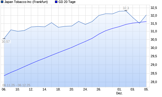 Mit dem Anstieg auf 32,04 EUR hat die Japan Tobacco-Aktie am 05.12.2025 die 20-Tage-Linie nach oben gekreuzt.Die Japan Tobacco-Aktie befindet sich seit dem 01.08.2025 im langfristigen Aufwärtstrend ...weiterlesen