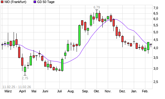 Mit dem Anstieg auf 4,16 EUR hat die Nio-Aktie am 10.02.2026 die 50-Tage-Linie nach oben gekreuzt.Die Nio-Aktie befindet sich seit dem 05.01.2026 im langfristigen Abwärtstrend und hat ...weiterlesen