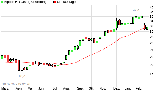 Mit dem Anstieg auf 32,40 EUR hat die Nippon Electric Glass-Aktie am 18.02.2026 die 100-Tage-Linie nach oben gekreuzt.Die Nippon Electric Glass-Aktie befindet sich seit dem 23.07.2025 ...weiterlesen