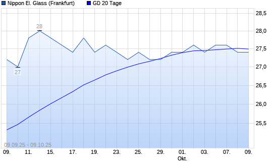 Mit dem Rücksetzer auf 27,40 EUR hat die Nippon Electric Glass-Aktie am 08.10.2025 die 20-Tage-Linie nach unten gekreuzt.Die Nippon Electric Glass-Aktie befindet sich seit dem 23.07.2025 ...weiterlesen