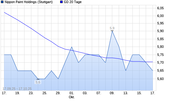 Mit dem Rücksetzer auf 5,65 EUR hat die Nippon Paint-Aktie am 16.10.2025 die 20-Tage-Linie nach unten gekreuzt.Die Nippon Paint-Aktie befindet sich seit dem 14.08.2025 im langfristigen ...weiterlesen