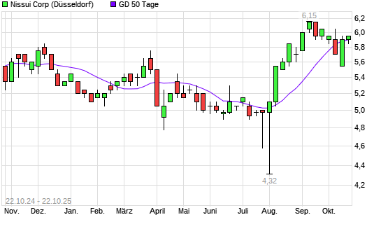 Mit dem Rücksetzer auf 5,90 EUR hat die Nippon Suisan Kaisha-Aktie am 21.10.2025 die 50-Tage-Linie nach unten gekreuzt.Die Nippon Suisan Kaisha-Aktie befindet sich seit dem 05.08.2025 im ...weiterlesen