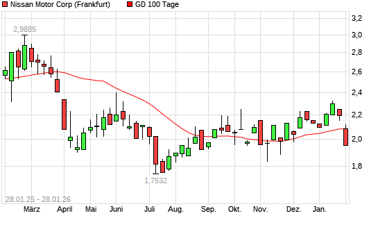 Mit dem Anstieg auf 2,12 EUR hat die Nissan Motor-Aktie am 27.01.2026 die 100-Tage-Linie nach oben gekreuzt.Die Nissan Motor-Aktie befindet sich seit dem 08.12.2025 im langfristigen Aufwärtstrend ...weiterlesen