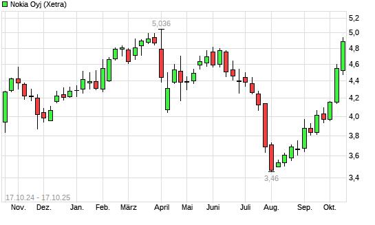 Mit dem Anstieg auf 4,89 EUR hat die Nokia-Aktie (ISIN FI0009000681) am 16.10.2025 ein neues 6-Monats-Hoch erreicht und damit den Kurs vom 28.05.2025 eingestellt.Die Nokia-Aktie befindet sich ...weiterlesen