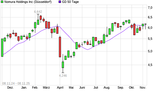 Mit dem Anstieg auf 6,19 EUR hat die Nomura-Aktie am 07.11.2025 die 50-Tage-Linie nach oben gekreuzt.Die Nomura-Aktie befindet sich seit dem 13.10.2025 im langfristigen Aufwärtstrend und hat ...weiterlesen
