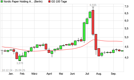 Mit dem Anstieg auf 4,23 EUR hat die Nordic Paper-Aktie am 09.12.2025 die 100-Tage-Linie nach oben gekreuzt.Die Nordic Paper-Aktie befindet sich seit dem 23.07.2025 im langfristigen Abwärtstrend ...weiterlesen