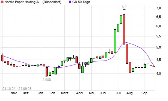 Mit dem Anstieg auf 4,23 EUR hat die Nordic Paper-Aktie am 30.09.2025 die 50-Tage-Linie nach oben gekreuzt.Die Nordic Paper-Aktie befindet sich seit dem 23.07.2025 im langfristigen Abwärtstrend ...weiterlesen