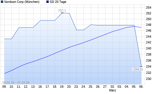 Mit dem Rücksetzer auf 240,50 EUR hat die Nordson-Aktie am 06.03.2026 die 20-Tage-Linie nach unten gekreuzt.Die Nordson-Aktie befindet sich seit dem 12.09.2025 im ...weiterlesen